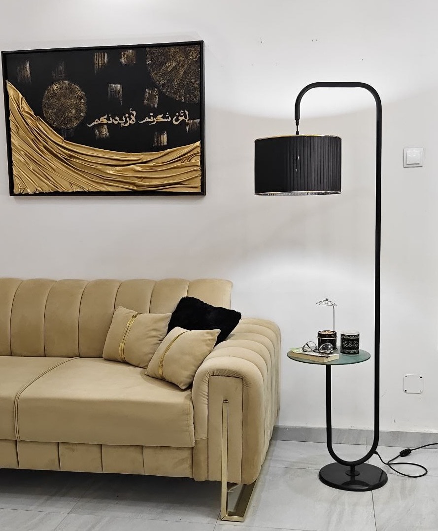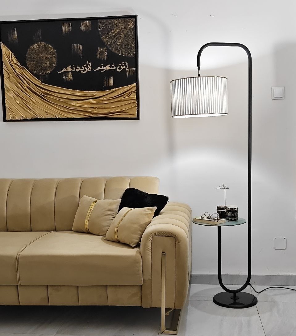 Lampadaire en métal 🔹Hauteur 170cm 🔹Table en verre 35cm hauteur 55 cm 🔹Base en marbre 🔹Abat-jour plissé en tissu anti tache